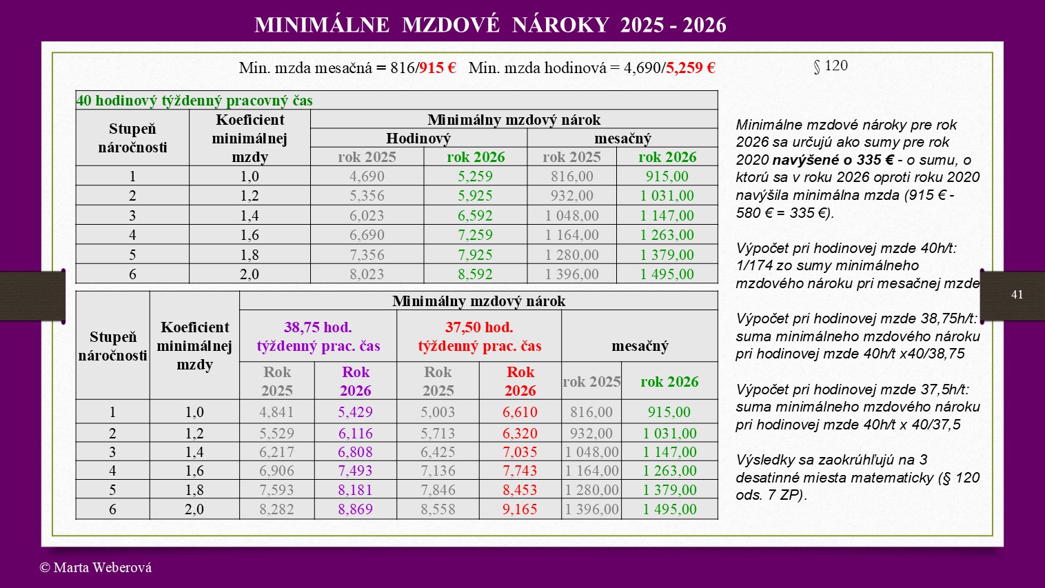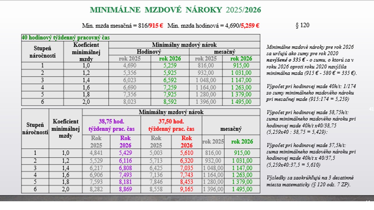 V nasledujúcich dvoch obrázkoch nájdete minimálne mzdové nároky a nové príplatky platné od 1. januára 2026